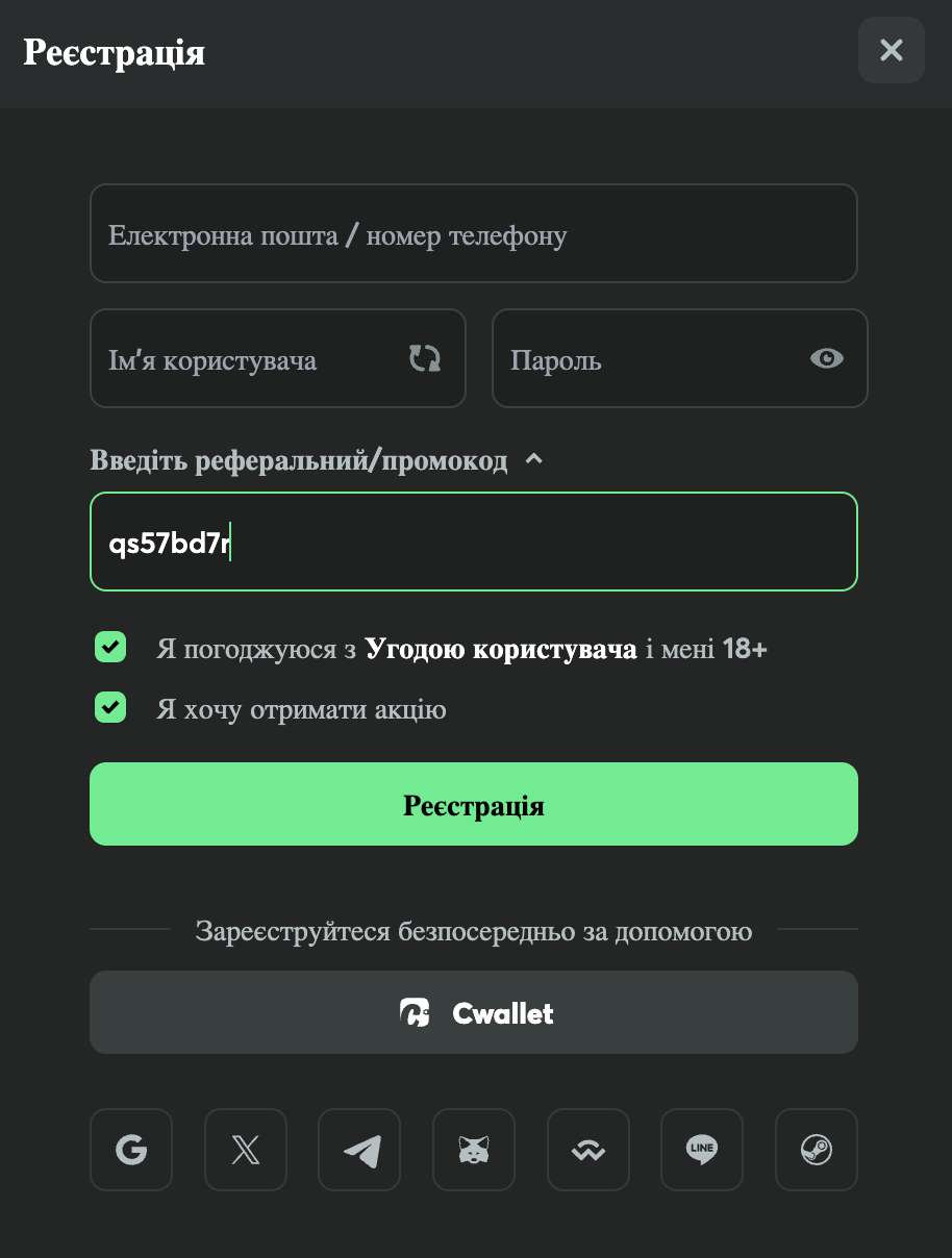Реєстрація на BC Game в Україні розрахована на швидкий старт. Новий користувач може створити акаунт за кілька хвилин без складних форм або багаторівневих перевірок, зокрема з можливістю використання промокоду “qs57bd7r”. Також доступна реєстрація через популярні сервіси та застосунки, такі як Google, X, Telegram, MetaMask, WalletConnect, LINE або Steam, що дозволяє ще швидше створити акаунт без зайвих дій.